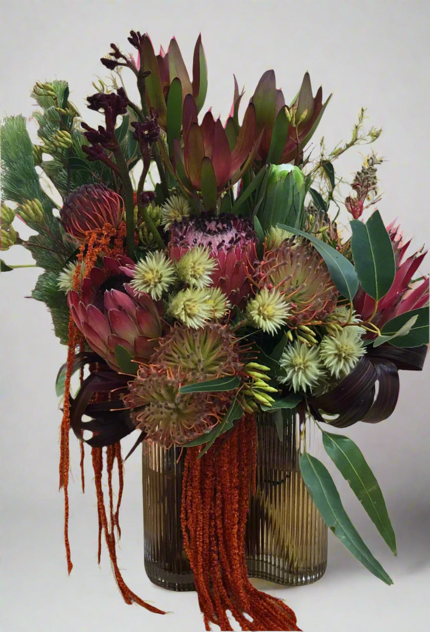 With a selection of proteas, banksias, Leucadendron's, Pin Cushions and native foliage's presented in a modern curved glass vase.
