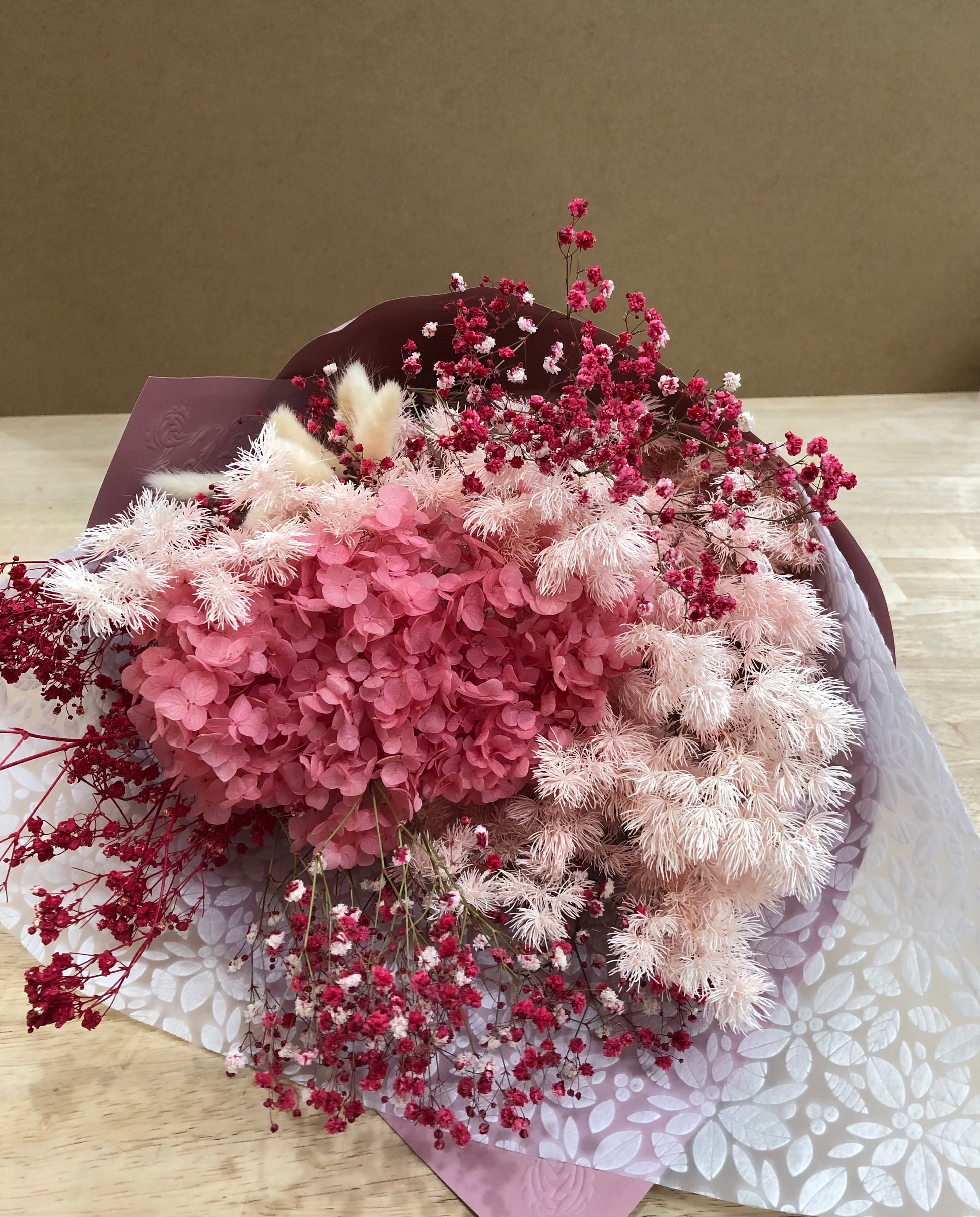 With preserved Hydrangea, Bunny Tails, dried Baby's Breath & preserved Ming Fern, arranged as a bouquet.