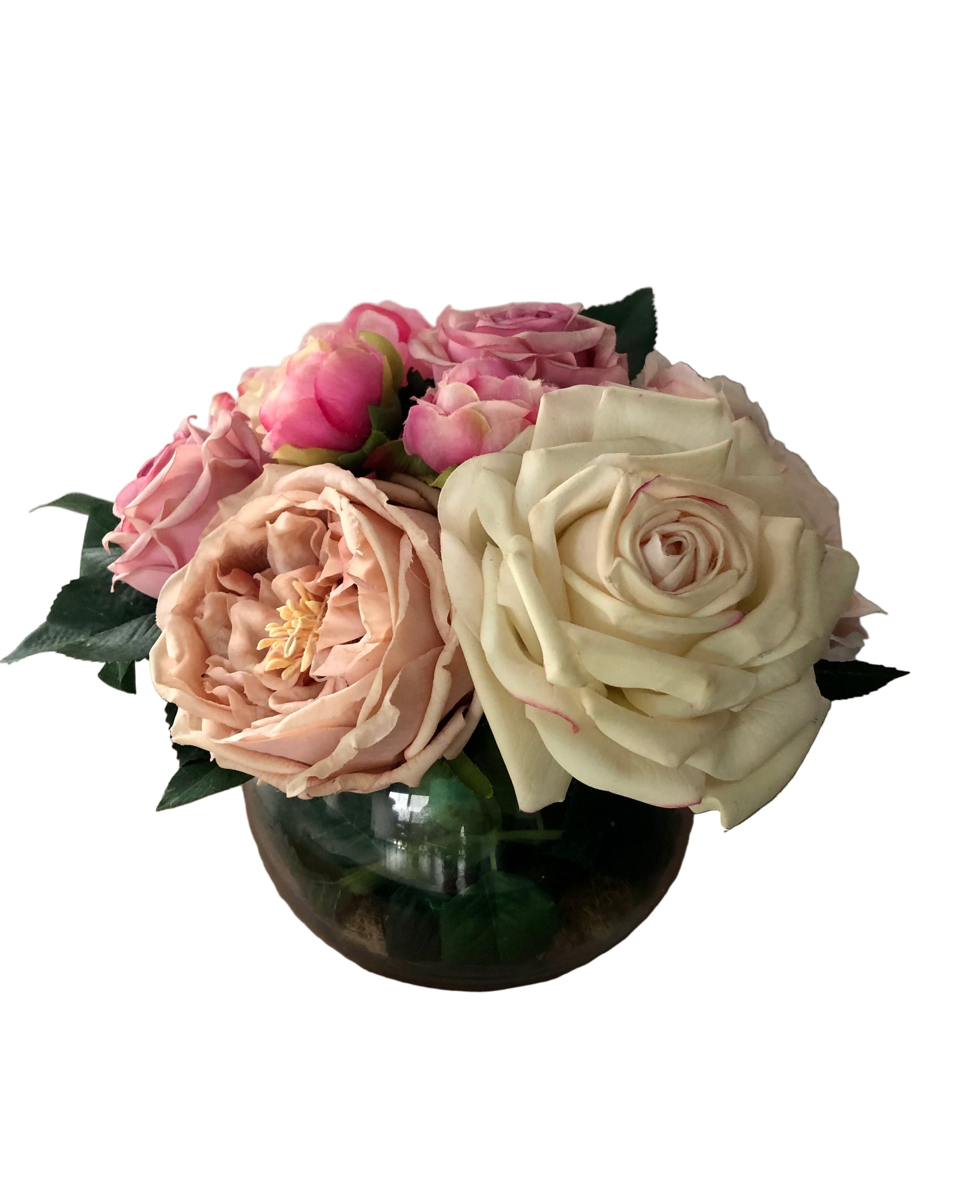 Artificial Roses and Peonies with greenery in a glass fishbowl vase. 25cm diameter.