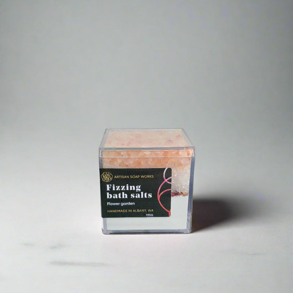 Luxurious fizzing bath salts, scented with a floral blend 170g Handmade by Artisan Soap Works in Albany.