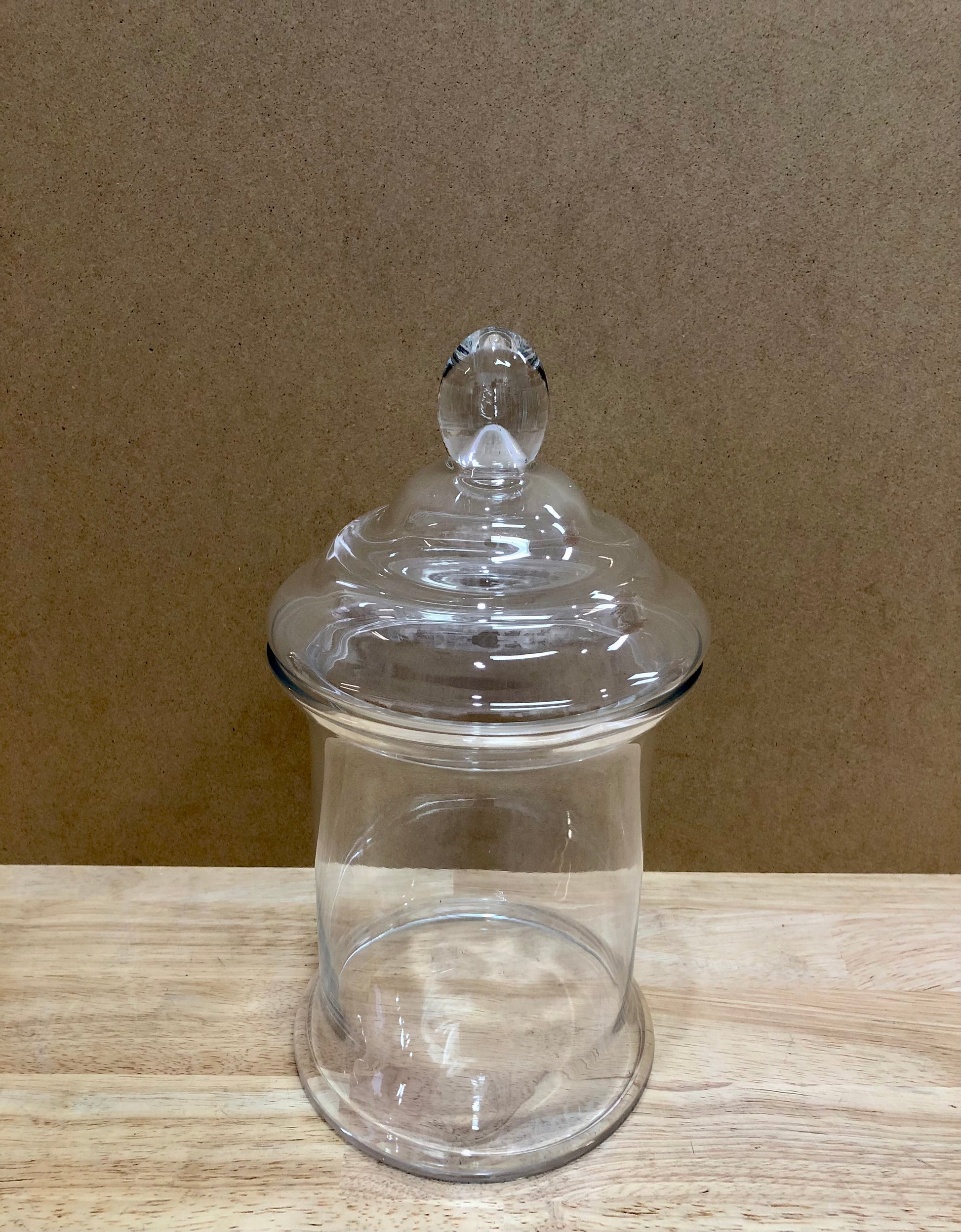 32cm h x 16cm w clear glass flat bottom candy jar with lid.