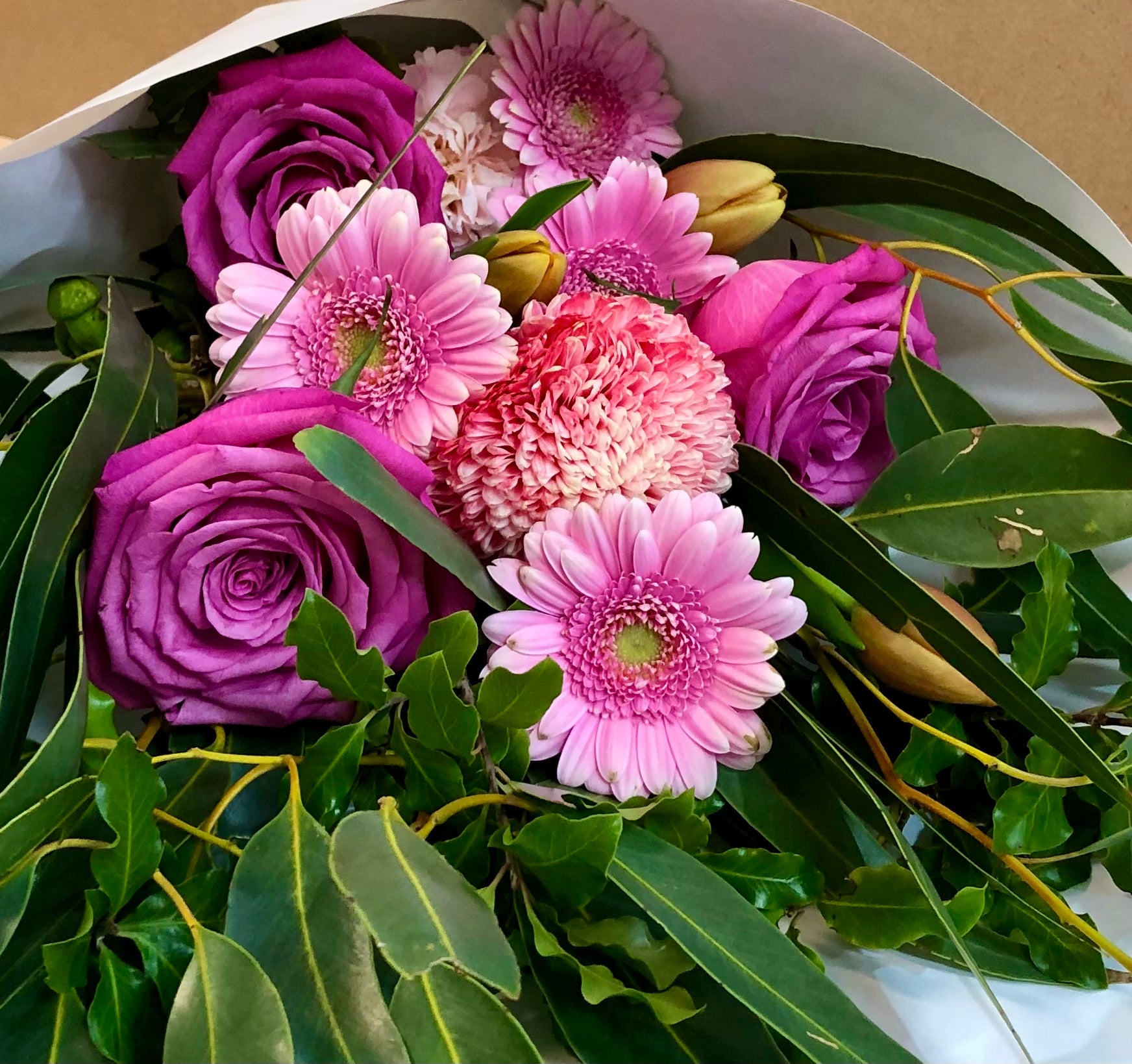 With lush greenery and a seasonal mix of pink flowers, pictured is the medium sheath.