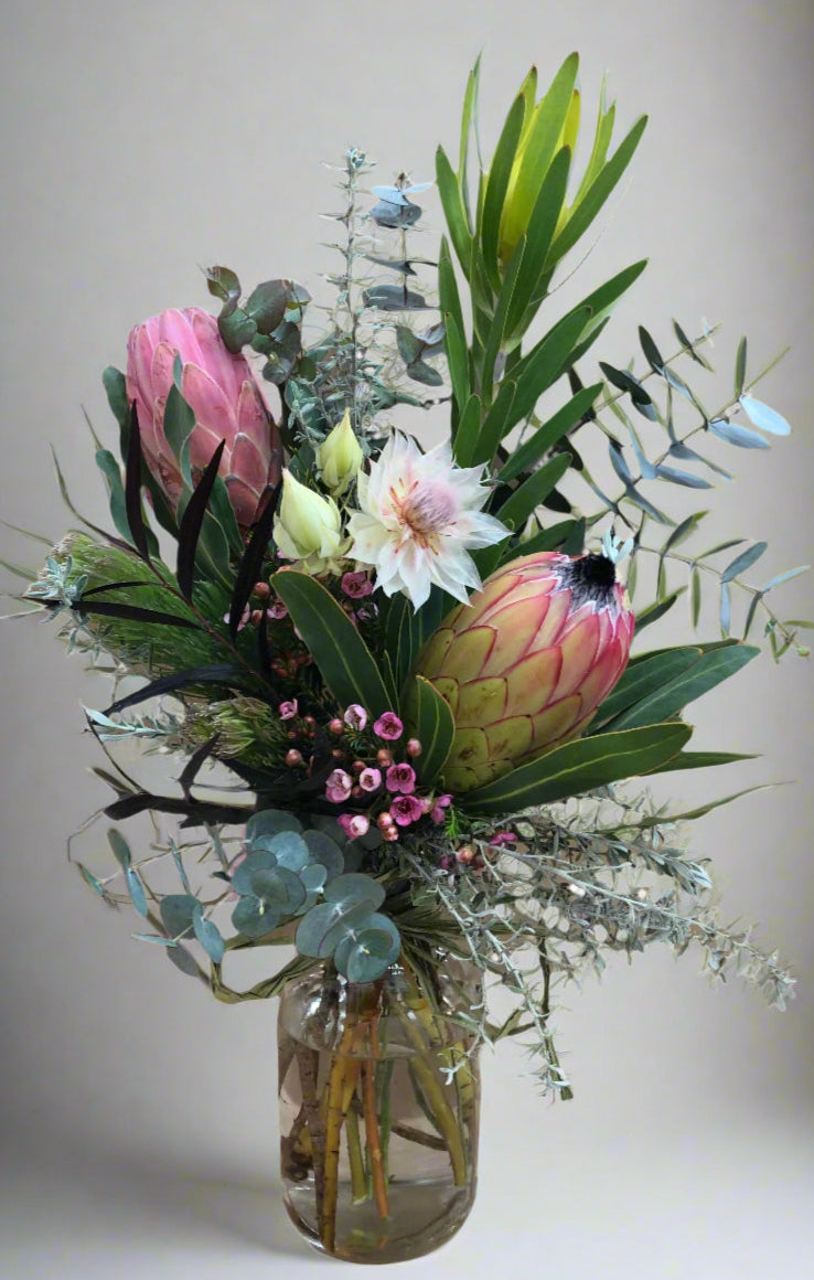 Presented in a clear glass bottle with a selection of seasonal natives and Foliage's with Bahen & Co Chocolate maker Honeycomb & Hibiscus Organic Chocolate 75g