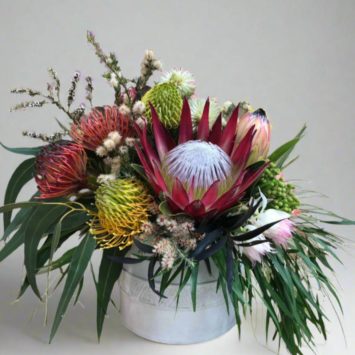 A native flower arrangement with locally source natives presented in a Tree Stripes brand pot.
