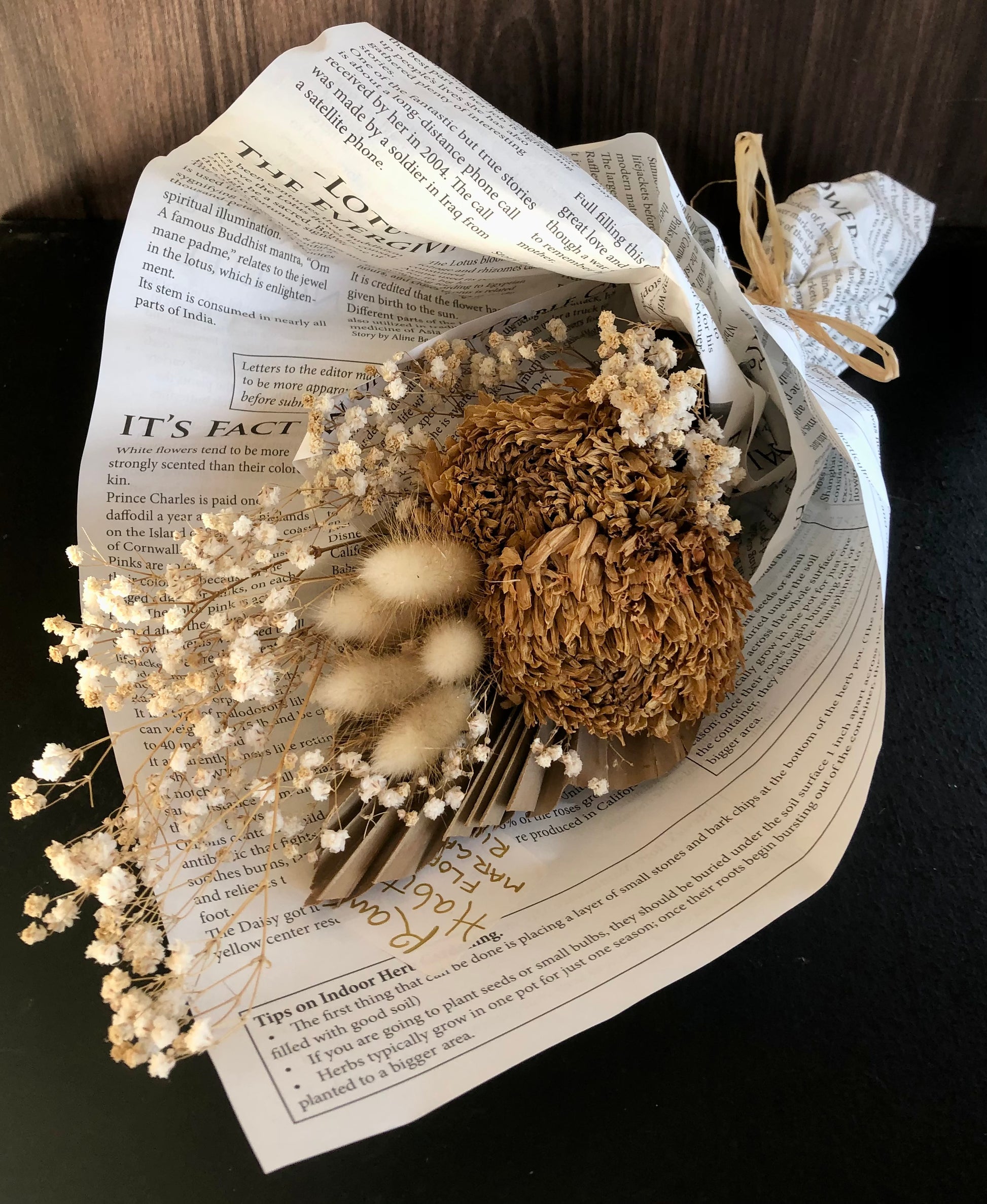 Small bouquet of dried disbuds, bunny tails, baby’s breath and fan palm.