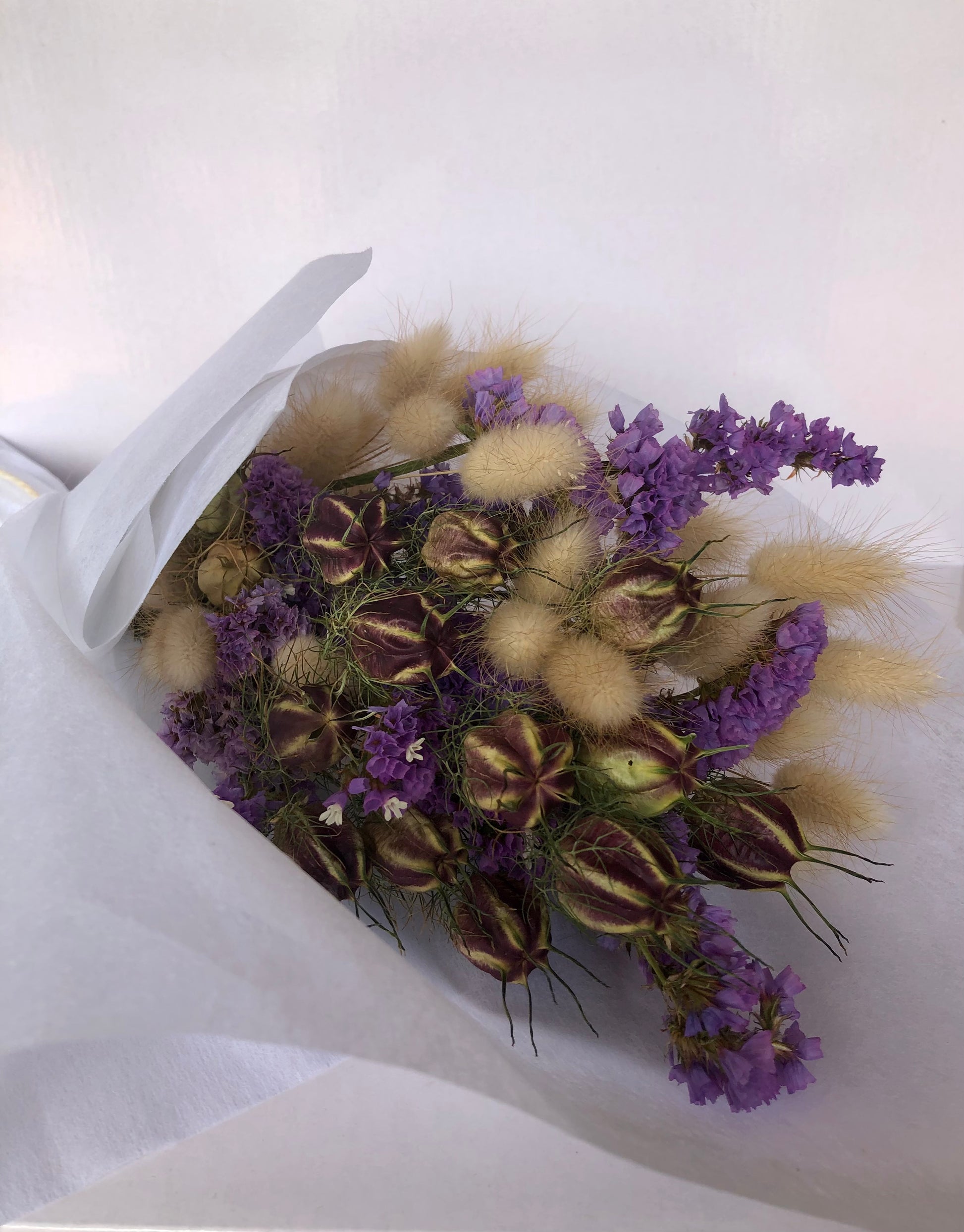 Naturally dried and spray free Bouquet with Nigella Pods, Purple Statice and Bunny Tails.