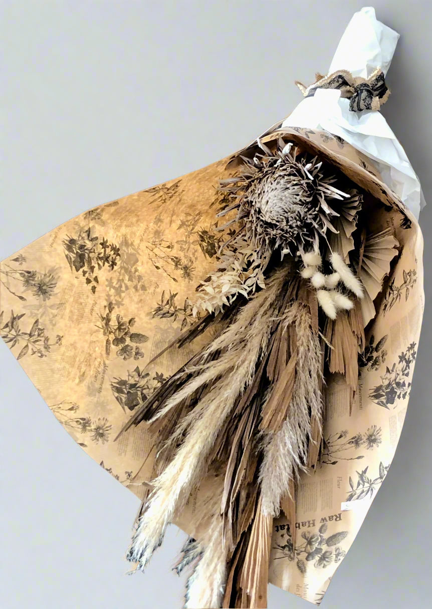 Dried flower bouquet with Pampas grass, a king protea, Fishtail Palm, Palms, Ruscus, Bunny tails.