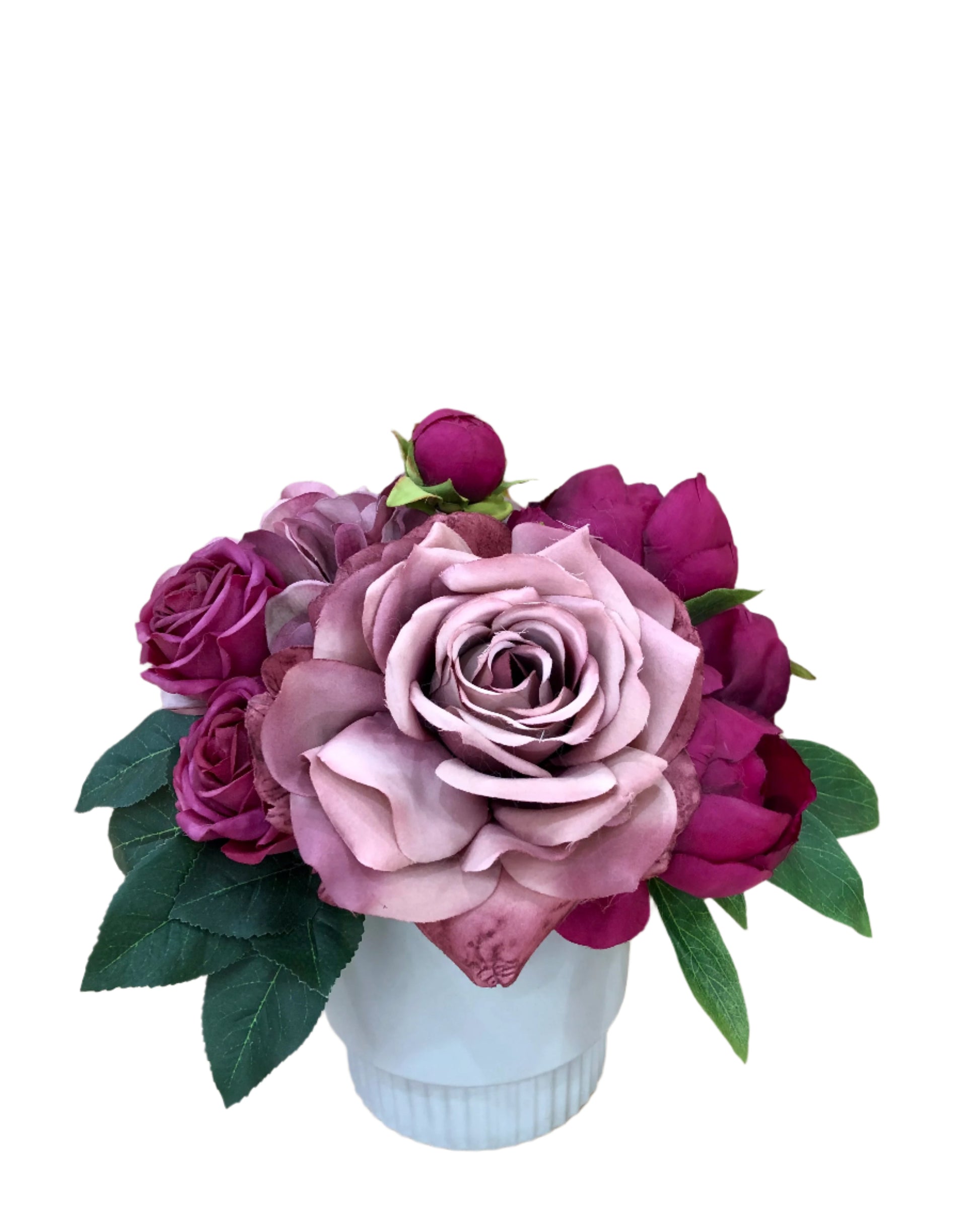 High quality artificial flowers all in shades of pinks with greenery with Roses, Hydrangea and Peonies in a grey matt ceramic vase.