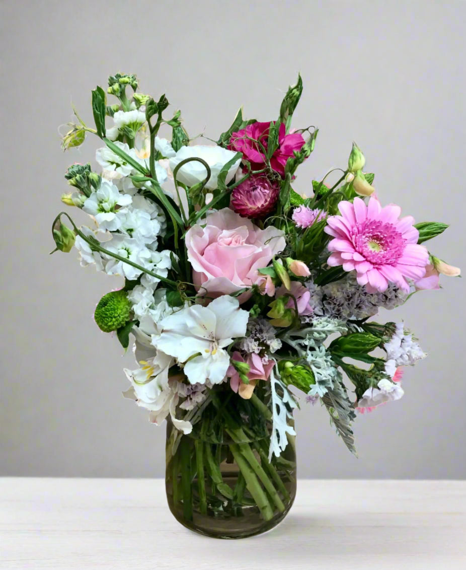 Presented in a glass vase in whites and pinks with silver foliage's. Flowers may differ from pictured due to seasonal availability. Pictured is the medium.