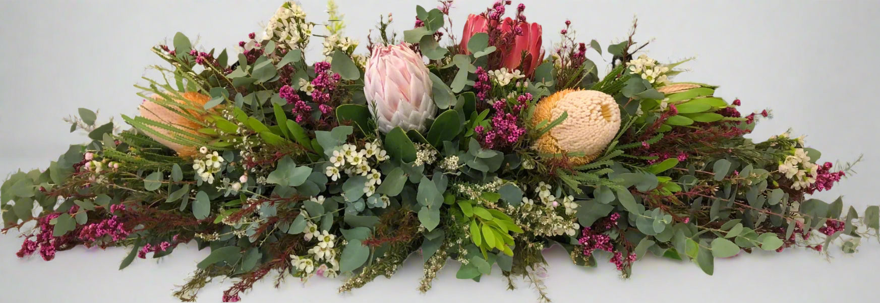 A lush native casket arrangement, we require 48hrs notice for this arrangement. Available for delivery or pick up from the store.