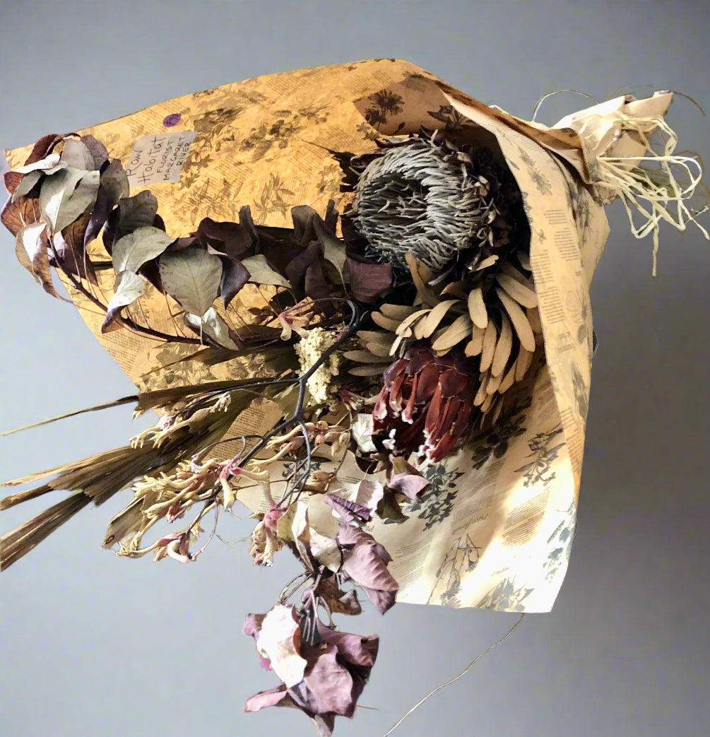 Dried bouquet with King Protea, queen Protea, Smoke bush, Kangaroo paws, Fishtail Palm and Morrison.